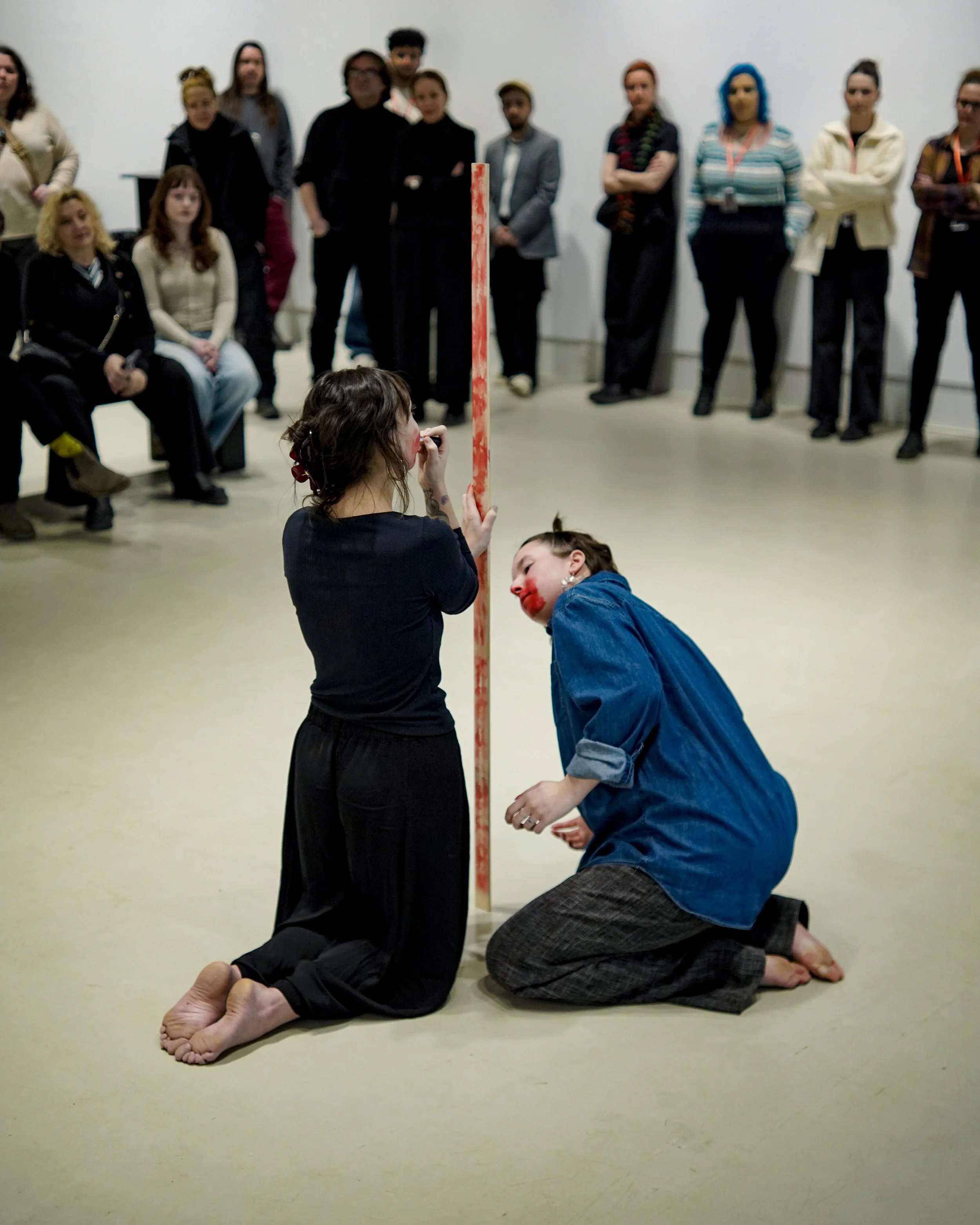 Bouche (Mouth) stages two female performers facing one another, separated by a piece of wood that acts as a transfer surface. As one applies red lipstick, the other takes the material from her mouth and deposits it onto the wood. Through this repetitive gesture, the red pigment becomes the trace of a feminine voice being transmitted, translated, transformed.